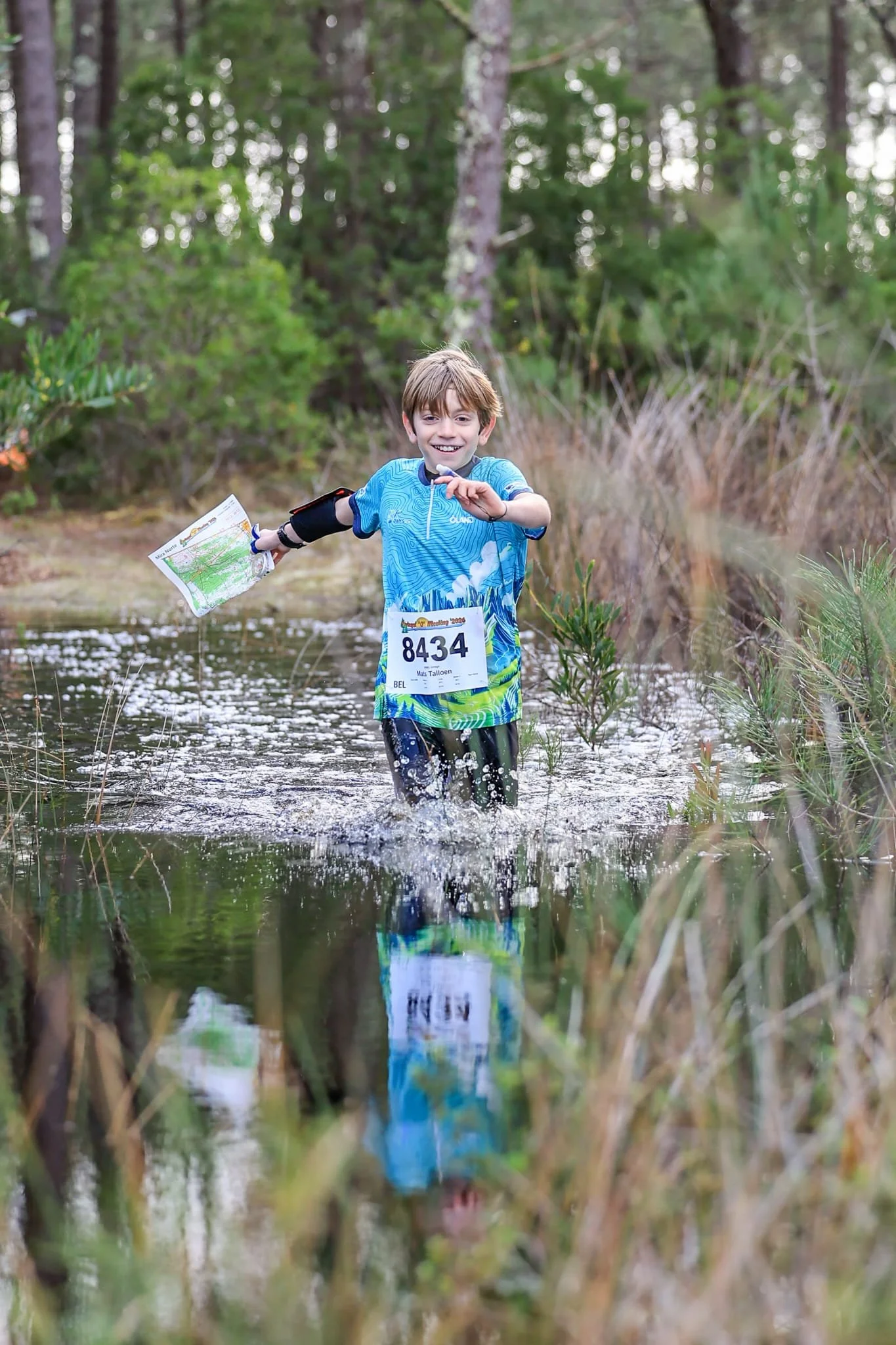 Dag 2 bracht de long distance. Op papier klonk dat al als een stevig avontuur, en de organisatie had vooraf vriendelijk gewaarschuwd: hier en daar kon je 10 tot 20 cm water tegenkomen, maar geen paniek, het bleef veilig. Dat bleek achteraf een schattige understatement. 10 tot 20 cm werd op sommige plaatsen eerder “welkom in het plaatselijke openluchtzwembad”. Er waren stukken waar je tot aan je middel door het water moest ploeteren, alsof de wedstrijd stiekem een triatlon-ambitie had ontwikkeld zonder ons iets te vertellen.